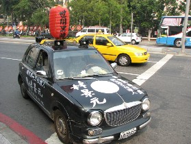 无党籍高雄市长候选人林景元设计的“世间黑暗”宣传车,19日在街头亮相,他强调现在世间黑暗,连白天都要点灯,所以他以布袋戏人物“照世明灯”的角色推出“灯笼车”,期照亮社会,穿梭在车流中很醒目。(来源:台湾《联合报》 摄影:陈金声)