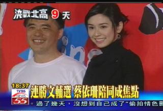 据台湾TVBS报道,连胜文订婚后首度携未婚妻蔡依珊替候选人辅选。面对众多的镜头,蔡依珊视看看左,再看看右,第一次参与辅选拍合照的她,十几台摄影机相机,让她都不知道该看哪一台了。