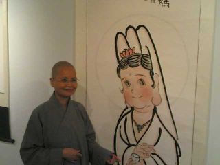 据台湾“中广新闻网”报道,画佛像已经十多年的果梵法师,在台中县立文化中心展出“甘露画展”,共有50多幅作品。其中,以不同法相呈现的观世音,造型庄严慈蔼,让参观者伫足流连。其中,有几幅以可爱的卡通造型呈现,相当特别。果梵法师表示,卡通造型观音,可以让民众更容易亲近佛法,甚至也有基督徒收藏。