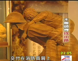 林进昌10年前拿下第一届“裕隆木雕金质奖”首奖的作品“抢救”,一直长期珍藏在木雕博物馆内让民众欣赏。林进昌:“这个作品,应该算是我初期在转型,从神像开始转到写实人物方面的作品,那个时候,我只是想要摆脱神像的味道,像脸部啊,我尽量是用朝比较写实的手法去表现。”