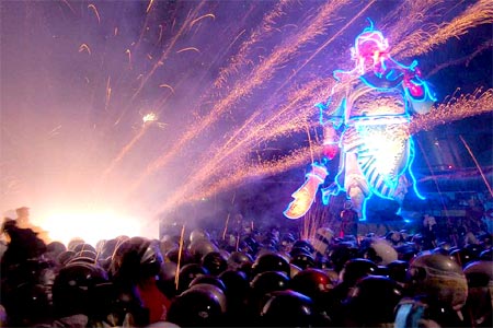 台南县盐水蜂炮4日晚间点燃,主炮城是一座高约10米、以关公为造型的塑像。现场电光石火,有如关公显灵。(图:台湾《中国时报》)
