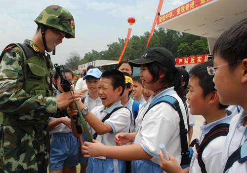 中新网5月20日电 为庆祝香港回归十周年,来自香港十间小学的四百四十名师生十九日在广东公安边防总队七支队的深圳银湖训练基地度过了一次特别的军事夏令营。