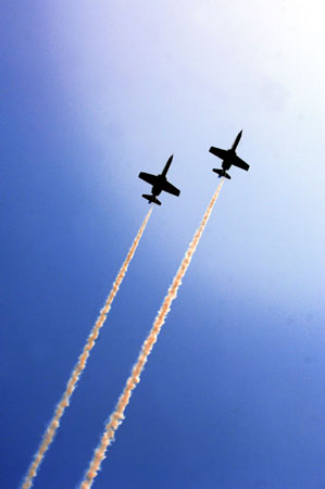 清晨六点二十三分,两架F-16战机首先飞越松山机场上空,接着依序是IDF、幻影2000,以及两架喷着彩烟的“雷虎小组”AT-3喷射教练机编队通过。