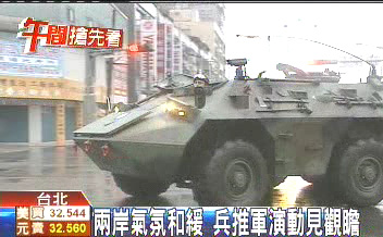 中新网6月5日电 据台湾TVBS报道,马英九“出访”中美洲返台后次日一大早5点钟,赶着搭乘装甲车,参加任内头一回的“汉光兵推”。