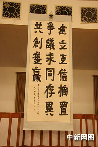 图为书画家所作的胡锦涛总书记对台16字方针书法作品。