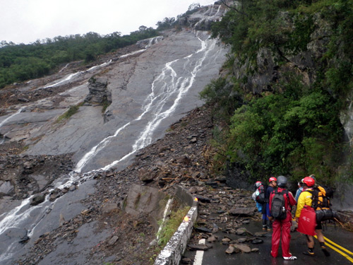 屏东县雾台乡全乡受困,主要道路台24线多处坍方,救难人员翻越进入救援。