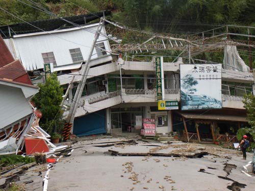超大豪雨重创嘉义县梅山乡太和村,造成当地茶厂、民宿等建物倾斜,地面龟裂,彷佛历经大地震,让人一下子找不到地平线