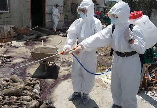 台湾军方13日在嘉义县境家禽场附近喷洒消毒水,避免疫情发生