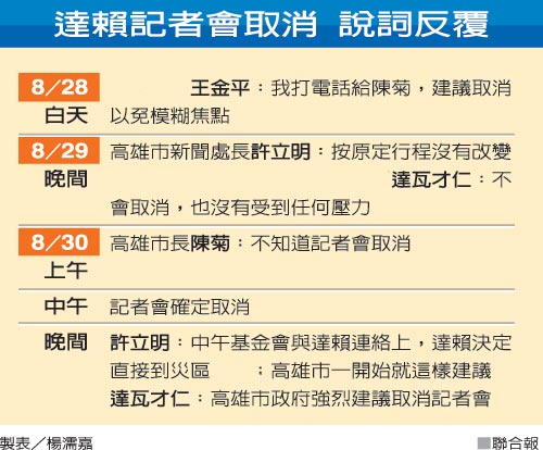 达赖记者会办不办成30日焦点,陈菊30日上午受访时还坚称记者会照旧,直到达赖方面表示取消后,才对外说“直赴灾区原就是她的建议行程”,引起外界质疑是高雄市府事后“自圆其说”。