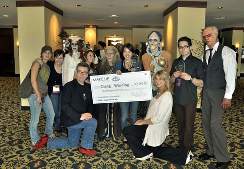 台湾美眉程薇颖(后右 4)18日在全球彩妆好手竞争下胜出,夺得在温哥华举行的国际彩妆艺术家大赛(IMAT)冠军。“中央社”图