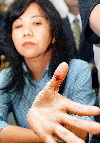混战流血。民进党“立委”叶宜津出示混战中受伤的大拇指。图片来源:台湾《苹果日报》