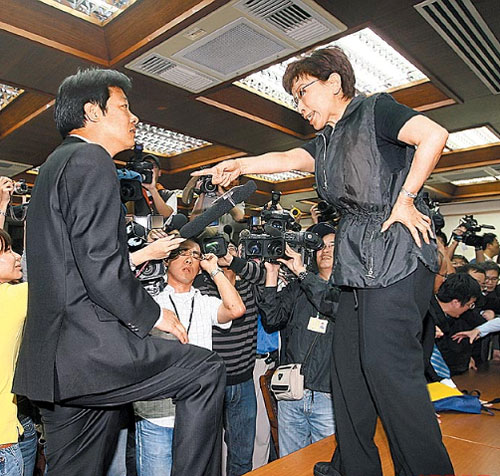 跳桌互呛。国民党“立委”洪秀柱(右)站在桌子上和民进党“立委”赖清德互呛。图片来源:台湾《苹果日报》