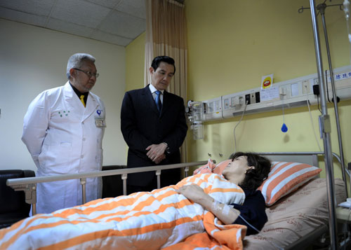 马英九(后右)21日晚间前往台大医院,探视上午在“立法院”教育及文化委员会冲突中昏倒的国民党籍立委赵丽云(前)。图片来源:“中央社”
