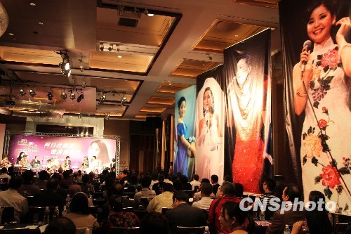 图为台北君悦大饭店现场,一侧悬挂邓丽君的大幅照片,伊人音容宛在、楚楚动人。中新社发 董会峰 摄