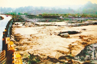 高雄地区23日中午开始受影响,甲仙乡的甲仙大桥便道,桥下楠梓仙溪滚滚翻腾。 图片来源:台湾《联合报》