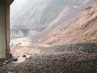 暴雨造成南投县通往东埔温泉的哈比兰明隧道坍方,有近80名游客受困山区。 图片来源:台湾《联合报》