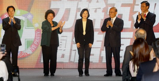 民进党年底“五都”市长参选人苏嘉全(右起)、苏贞昌、蔡英文、陈菊与赖清德,25日一同出席“力拼五都,团结再起”造势大会。(“中央社”图)