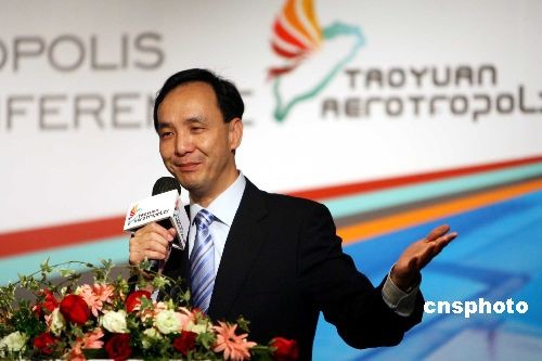 资料图:去年四月一日,时任台湾桃园县长的朱立伦在香港举办的“桃园航空城招商说明会”上表示,“桃园航空城”预计将可创造出超过一亿新台币的商业投资以及每年一亿以上的出口值,同时增加八万个工作机会。 中新社发 洪少葵 摄