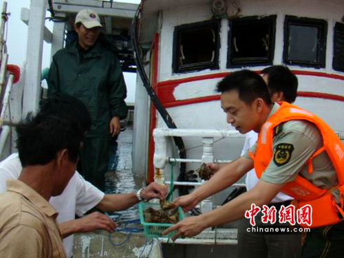 中新网惠安6月15日电 (林永传 郭斌 陈群峰)“嗯……好吃,跟台湾的口味差不多,谢谢你们边防民警……”15日,福建崇武边防派出所官兵为来辖区港口靠岸避风雨的19名台胞送上了“闽南肉粽”,受到了台胞的热烈欢迎。