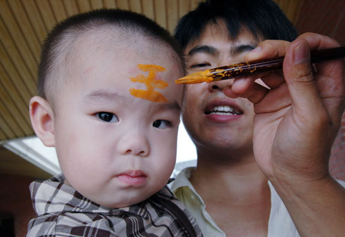 相传端午节时春夏交替、瘟疫较多,公立传统艺术中心16日举行“点雄黄,我是孩子王”民俗体验活动,提供雄黄酒在孩童额头写上“王”字,希望可增强阳气、驱邪避凶。 图片来源:“中央社”