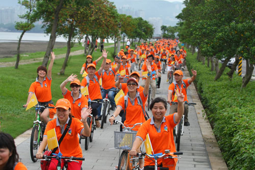 一家大陆直销厂商组近千人的旅游团赴台观光,17日在台北县八里骑自行车欣赏风景,部分步道被挤的水泄不通。 图片来源:“中央社”
