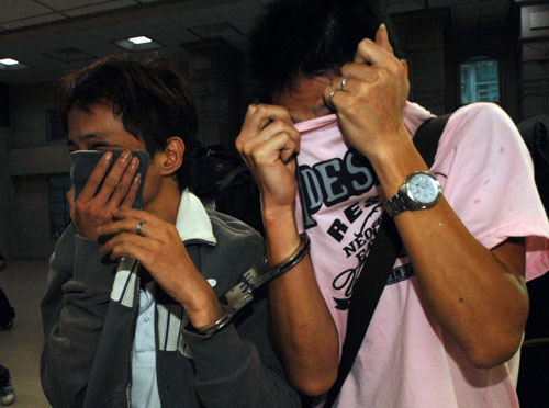 台湾籍嫌疑人在台“刑事局”被上铐送法办。图片来源:“中央社”