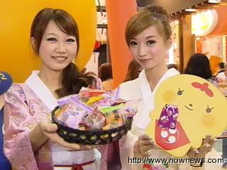 “欢迎试吃,很好吃喔!”秀场美女穿着日本和服打扮成樱花妹沿路发麻糬,其中一位还秀出修长美腿,不少男客人眼睛吃冰淇淋。