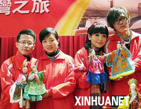 1月14日,两岸新人在体验台湾布袋戏时合影留念。来自大陆的26对新人搭乘两岸直航班机来到台湾,将参加于1月15日在日月潭举行的“日月同喜,喜传天下”集体婚礼并游览台湾名胜古迹,感受当地风土人情。新华社图