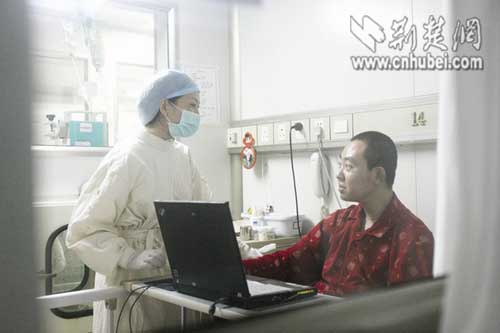 昨日下午,在武汉同济医院,隔着无菌病房的玻璃,19岁的张雷展出笑容和父亲打招呼。