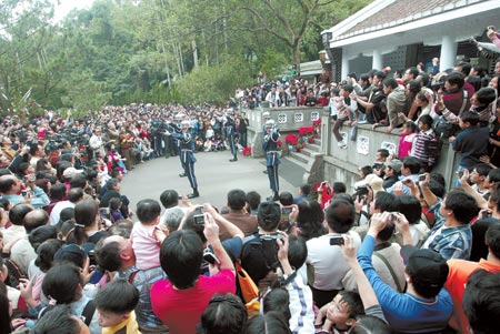 二十三日下午五点,位于桃园县大溪镇的两蒋陵寝拥挤了大批游客,台军仪队进行最后一次交接仪式后,陵寝管理处随即撤哨封园。