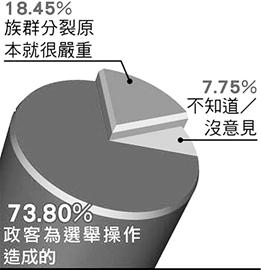 记者:根据台湾的民调,在现在台湾的政治现实里面,随着蓝绿的斗争,族群议题好像炒作得越来越严重?