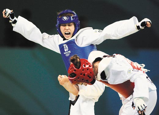 北京奥运跆拳道女子57公斤级比赛在北京科技大学体育馆举行,在铜牌争夺赛中,中华台北队苏丽文(蓝衣)输给克罗地亚选手,心情很难过。 中新社发 CNAsports 摄