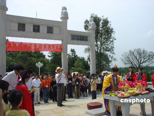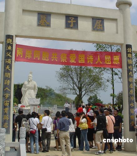 8月26日上午,正在湖南参加“2006两岸学子中华文化研习营”的86名台湾学子和部分大陆同胞齐聚岳阳屈子墓,用一场庄严肃穆、古朴简洁的“祭屈”大典,表达对这位爱国诗人的深深追忆和无限敬意。中新社发 邓霞 摄