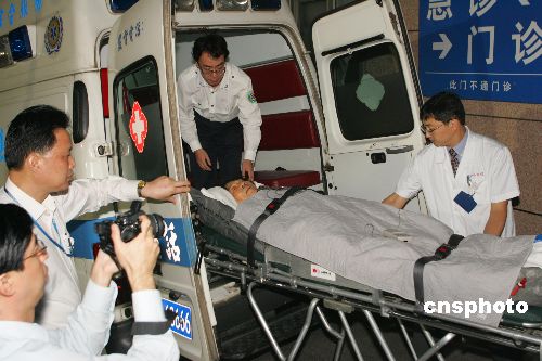 上海至台湾首例医疗专案包机于九月二十四日凌晨三时许自浦东国际机场起程赴台。图为此次两岸“人道包机”搭载者——八十一岁的台湾病人李江景梅自上海中山医院起程。中新社发 潘索菲 摄