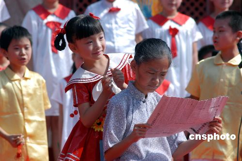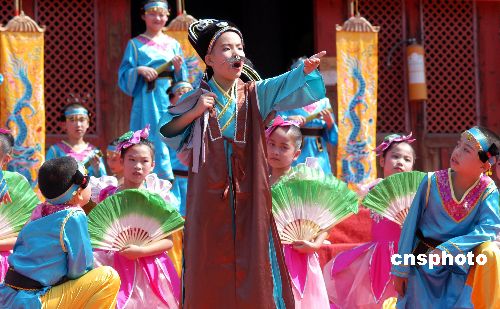 九月二十八日上午,泉州市近五百名学生在泉州市府文庙进行古筝演奏、中华古诗文诵读、大型民族舞蹈等表演,纪念孔子诞辰二千五百五十七周年。据悉,与此同时,台湾台南文庙也在进行传统的祭孔活动,五百名学生在孔子像前用蘸着泮池水的毛笔在泉州府文庙赠送的开笔石上写字。中新社发 傅丹丹 摄