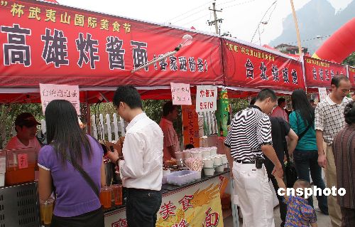 十月一日,福建省武夷山在旅游度假区举办国际美食节,印度飞饼、朝鲜打糕、日本寿司、新加坡水果冰山与港台美食让此间民众与游客大饱口福。其中,十二个展位四十多个品种的台湾美食亮相美食节,备受游客青睐。中新社发 周文杰 摄
