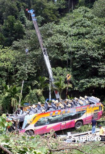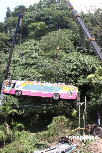 10月3日中午,台湾南投遭遇车祸的旅游巴士正被吊离信义乡事故现场。该部旅游巴载着十九位大陆游客和一位台湾导游,10月2日晚间途经上述路段遭遇重大车祸,造成六人死亡,十五人受伤。中新社发 黄少华 摄