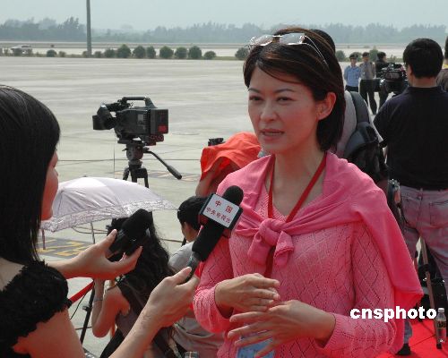 两岸农业合作论坛将于十七日至十八日在海南博鳌举行,海内外六十一家媒体的三百余名记者抵达采访,两岸记者更是踊跃。图为中央电视台记者十月十六日下午在海口美兰机场采访台湾东森电视台名主持卢秀芳。中新社发 王辛莉 摄