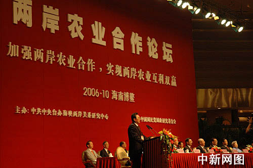 中新网博鳌10月17日电 (记者 刘舒凌 杨旭 王辛莉)由中共中央台湾工作办公室海研中心与中国国民党国政研究基金会共同主办的两岸农业合作论坛17日上午9时在博鳌开幕。开幕式由中台办主任陈云林、国政研究基金会副董事长林丰正共同主持。