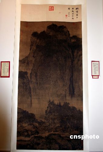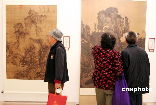 10月17日,台北故宫博物院“镇馆三宝”在沈阳鲁迅美术学院美术馆展出。“镇馆三宝”有北宋精品:郭熙的《早春图》、唐代精品李唐的《万壑松风图》、中国绘画史上不朽之作范宽的《溪山行旅图》。据悉,为期10天的《国宝争辉——珍藏书画复制精品展》包括了台北故宫博物院、上海、天津、辽宁博物馆等数百件书画珍品,此次同时出展。中新社发 刘宝成 摄