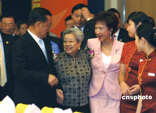 10月18日晚,厦门市国际会展中心宴会厅,中共中央政治局委员、国务院副总理吴仪,宴请中国国民党荣誉主席连战一行。图为宾主步入宴会厅。中新社发 郑祚声 摄