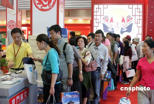 十一月四日,首届“海峡两岸台北旅展”吸引众多台湾民众。图为大陆展区展台前,众多民众排队领取旅游资料。中新社发 邢利宇 摄