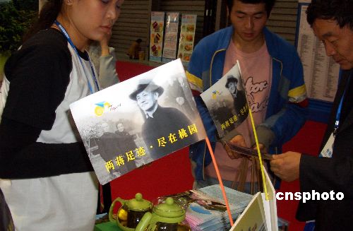 十一月十七日,虽然大陆居民赴台游尚未正式开放,但别具台湾特色的“蒋公足迹游”在此间首度高调登陆中国国际旅游交易会。台湾业者期望能借此提前挖掘大陆潜在的游客市场。现场派发的“两蒋足迹、尽在桃园”宣传小旗及蒋介石肖像书签,一度供不应求。中新社发 许晓青 摄