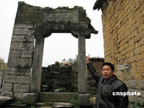 十一月下旬,正在湖南参加“第四届海峡两岸新闻媒体联合采访”的记者团走进位于湖南凤凰县阿拉营镇的古老土家村寨——书家堂。居住在这个偏隅小村寨的二百多户人多数姓杨,他们自称是杨家将的后裔。图为自称是杨业的第三十七代孙、三十六岁的杨秀河带记者参观古寨遗留的门匾。中新社发 白祖偕 摄