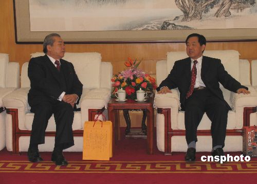 十一月二十七日上午,河南省政协主席王全书在河南省人民会堂会见了出席河南省华侨爱心事业基会揭牌仪式暨爱心电影故事片《雪儿》新闻发布会的台湾海峡两岸和平统一促进会会长郭俊次先生,宾主双方就祖国和平统一大业进行了亲切友好的交谈,并互赠礼品。中新社发 史宝银 摄