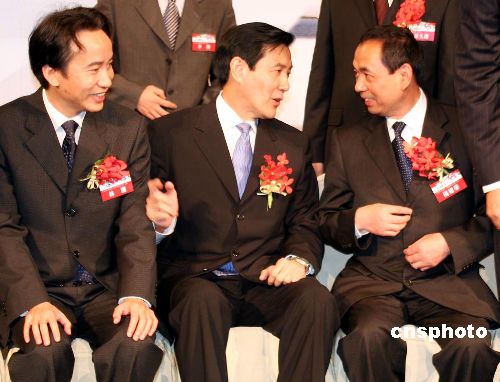十一月二十八日,上海市人民政府台湾事务办公室主任杨建荣(右)率长江三角洲十六城市官员出席在台北举办的长江三角洲与北台湾区域对话城市论坛。在与出席论坛的大陆官员合影时,台北市长马英九(中)对杨建荣主任说:“这些大陆城市的名字好熟悉噢!”中新社发 耿军 摄
