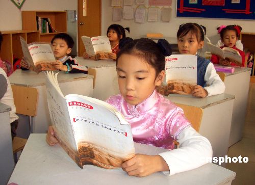 十二月一日,上海招收台湾学生总数最多的民办中芯学校内,一群台湾籍小学生梳起“书童头”、身穿小唐装,手捧古文经典,朗朗开读。在上海,台湾学生较集中的中、小学,时下都纷纷开出“读经”兴趣小组或专门课程。内容包括《三字经》、《百家姓》、《论语》和《唐诗三百首》等。中新社发 许晓青 摄