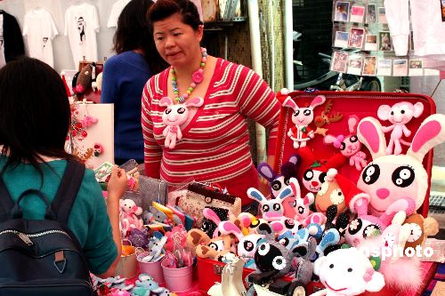 台湾近年提倡发展文化创意产业,12月的周末,台北市的一些社区辟出专门区域出售文化创意产品。这位“文化商人”自制的卡通玩具颇受女生的喜爱。中新社发 耿军 摄