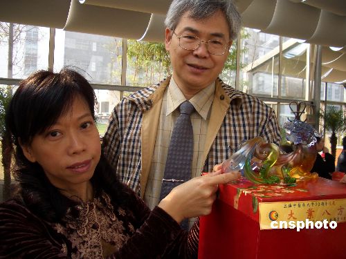 十二月八日,大陆培训的首批台湾中医师代表顾明津(右)、林姿里等返抵母校上海中医药大学“谒祖寻根”。这些率先通过大陆中医师资质考试的台湾学生,大多已是岛内资深的中医学教授,他们向母校敬赠了台湾特色的琉璃工艺品,以表达对母校“贺寿”的喜悦之情。当天是上海中医药大学成立五十周年大庆,该校也是上海目前招收台湾学生最多的高等学府。中新社发 许晓青 摄