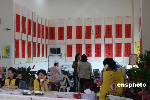 十二月九日,高雄市长选举就要正式投票,高雄市长选举竞争最激烈的是国民党藉候选人黄俊英与民进党藉候选人陈菊。图为黄俊英的竞选总部内挂满友人赠送的“高票当选”的祝福红幛。中新社发 耿军 摄